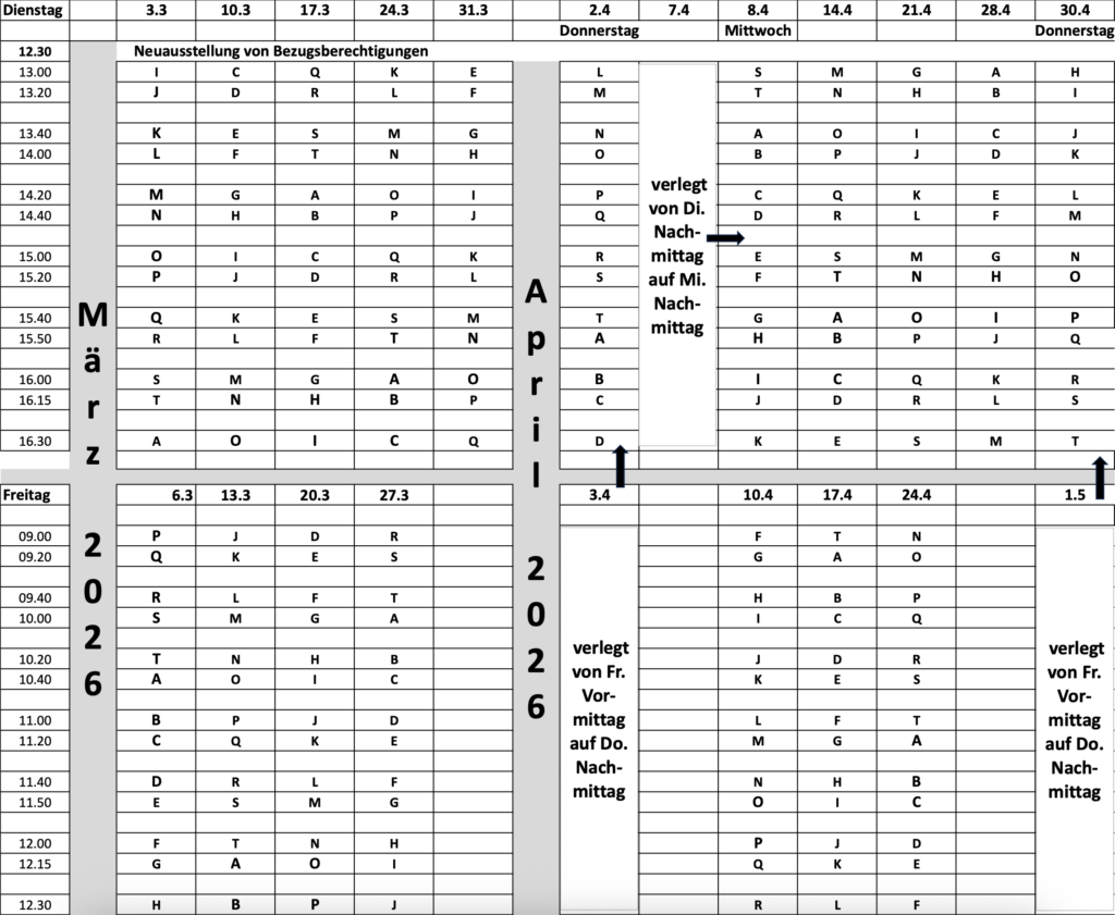 Ausweisausstellung: jeden Dienstag um 12:30 Uhr.